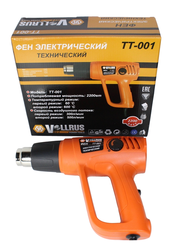 Фен технический Vollrus TT-001 предназначен для генерации горячего воздуха, который может быть использован для сушки или снятия лакокрасочных покрытий, для сушки клеевых соединений и клейки путем нагрева, для монтажа окантовок, трубок и проч. методом горячей усадки, посадки с нагревом, горячей деформации, размораживания труб, разъема резьбовых соединений, сушки влаги, пайки лужения, дезинфекции и т. д. Потребляемая мощность 2200 Вт. Два температурных режима: 60°C и 600°C. Две скорости воздушного потока: 300л/мин и 500л/мин.