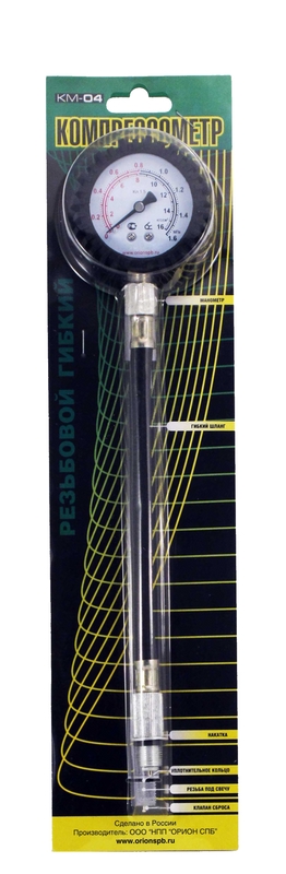 Компрессометр КМ-04 предназначен для измерения и контроля компрессии в цилиндрах бензиновых двигателей внутреннего сгорания легковых машин, грузовиков и мотоциклов. Измерения проводятся на прогретом двигателе, через отверстия для свечей зажигания. Главной особенностью компрессометров ооо "НПП "Орион" КМ-04, является использование гибкого шланга, что позволяет производить измерение компрессии в двигателе без демонтажа элементов затрудняющих доступ к отверстиям свечей. Данная конструкция создает дополнительное удобство при работе с компрессометрами.