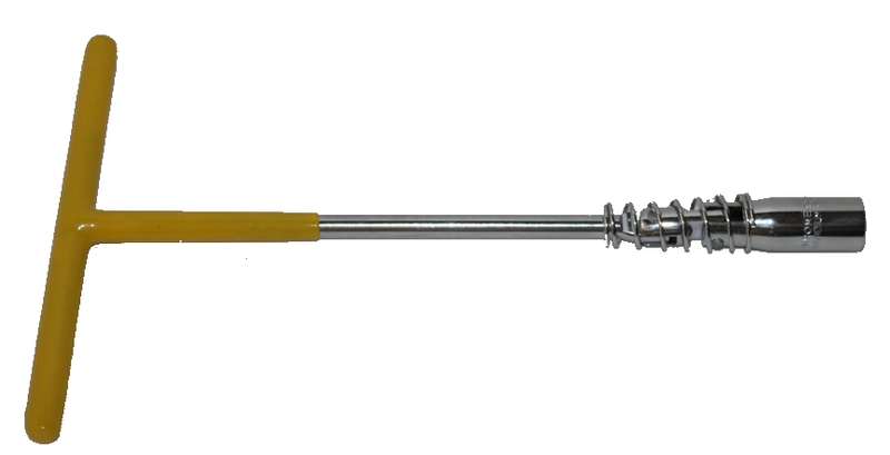 Т-образный свечной ключ удобно использовать для выкручивания свечей. Имеется шарнир с возможностью поворота в обеих плоскостях, а также Т-образная рукоятка, которая уменьшает усилие для вращения. Головка ключа изготовлена из прочной высококачественной инструментальной стали. Шарнир позволяет без труда работать в труднодоступных местах. Резиновая вставка внутри рабочего профиля позволяет удерживать свечу зажигания при ее извлечении из корпуса двигателя. Рукоятка специальной формы не скользит в руке и снижает нагрузку при длительной работе.